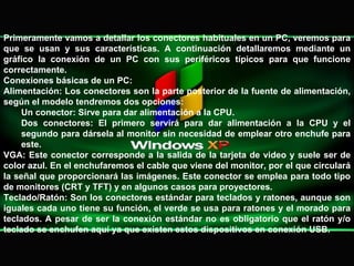 Este documento explica los diferentes conectores que tiene una computadora personal (PC) y cómo conectar los periféricos típicos como el monitor, teclado, ratón, impresora y otros dispositivos. Detalla los conectores de alimentación, VGA, USB, LPT1, COM, sonido y red, así como los diferentes tipos de puertos USB y sus velocidades de transferencia. Finalmente, incluye un diagrama guía para conectar correctamente una PC.