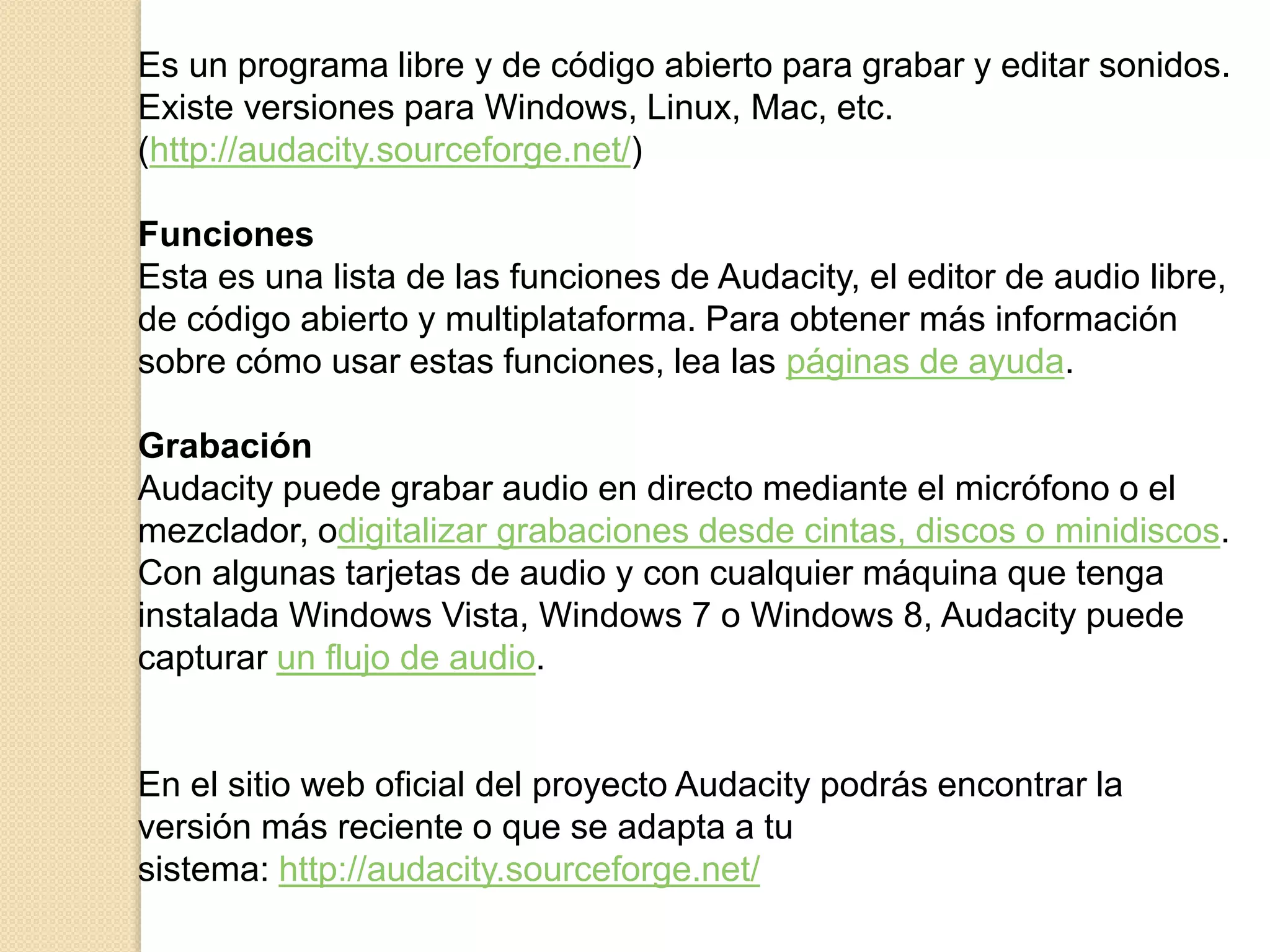 Este documento proporciona una introducción al programa de edición de audio gratuito y de código abierto Audacity, explicando sus funciones principales como la grabación, edición y reproducción de audio, así como la exportación de archivos en formatos como MP3. El documento también ofrece sugerencias sobre cómo utilizar Audacity en el aula, como grabar cuentos, entrevistas y mezclar audios con música de fondo.