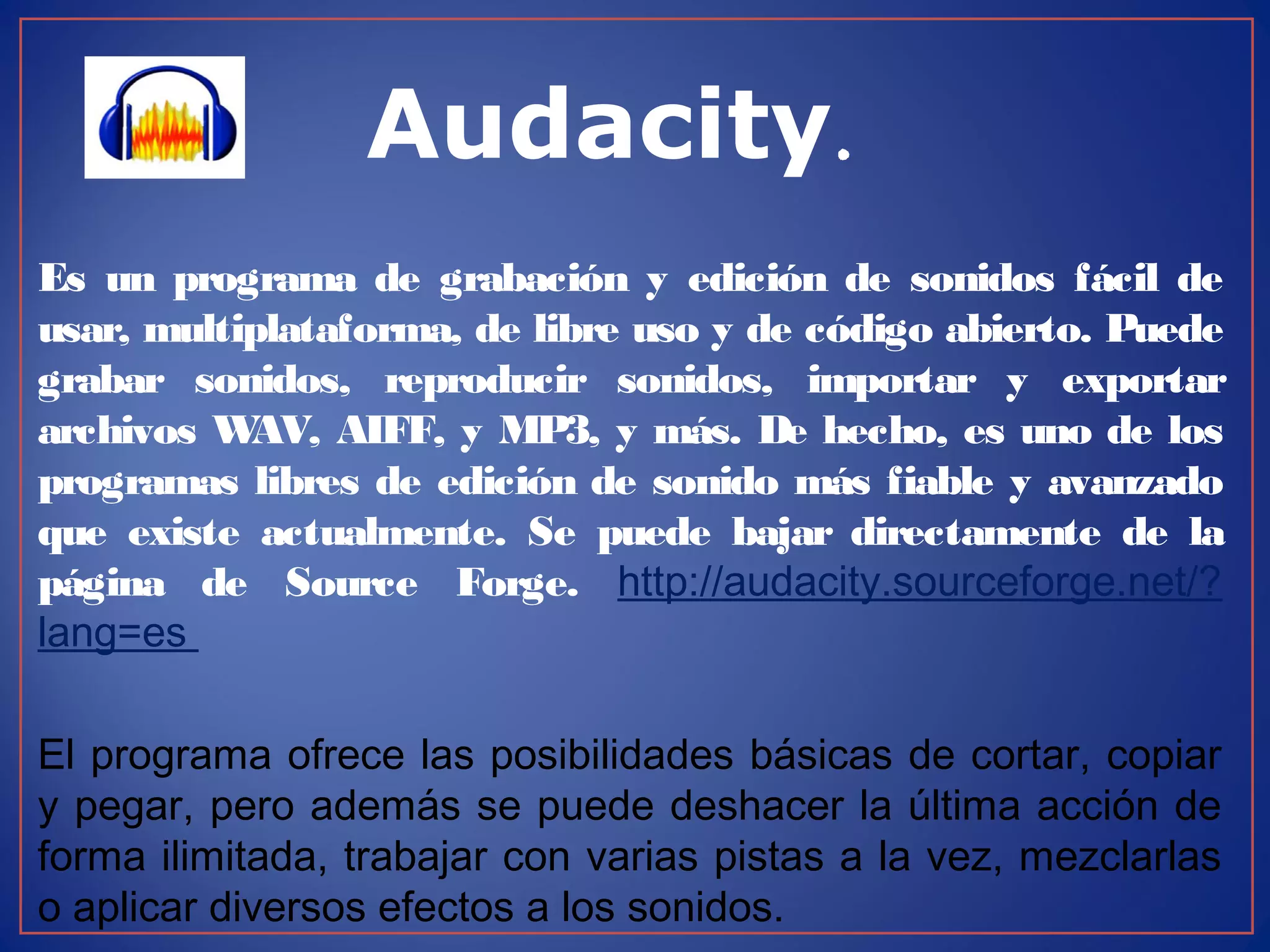 Audacity es un programa de código abierto, gratuito y multiplataforma para grabar, editar y mezclar sonido. Permite grabar sonido en vivo, importar y exportar archivos de audio, cortar, pegar y aplicar efectos a las grabaciones, como cambiar el tono o volumen. El documento proporciona instrucciones detalladas sobre cómo instalar y utilizar las funciones básicas de edición de Audacity.