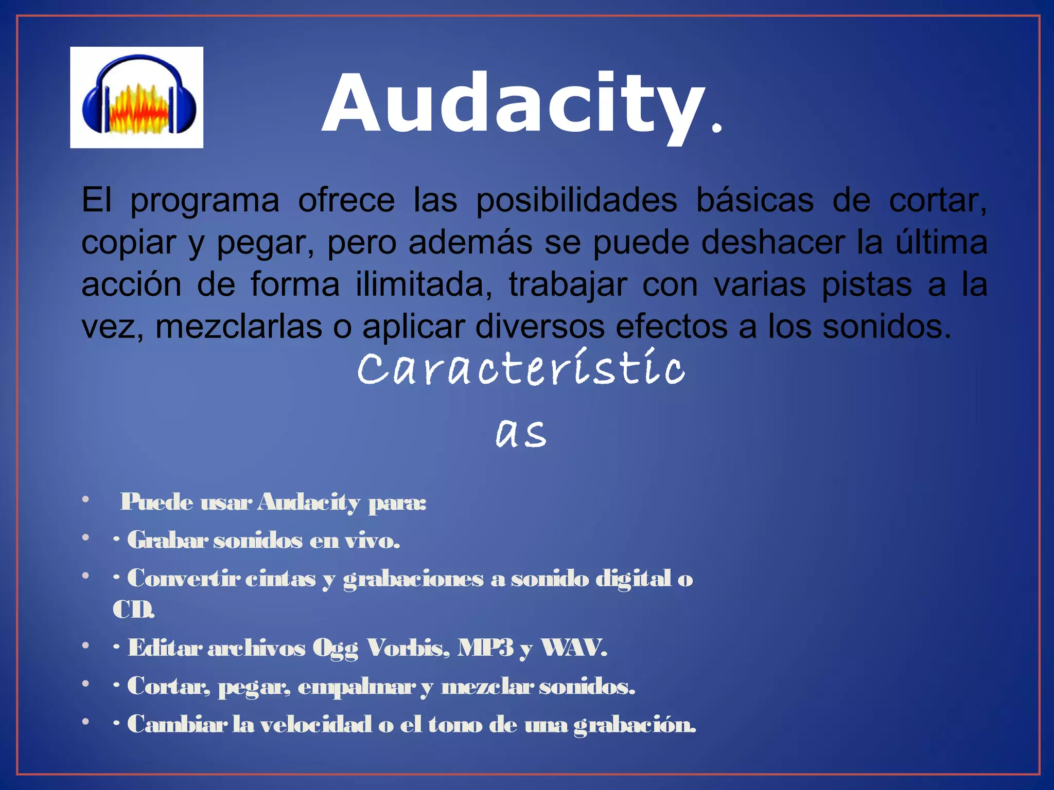El documento describe las características y funcionalidades del programa de edición de audio Audacity. Audacity permite grabar sonido, importar y exportar archivos de audio, editar sonido aplicando efectos como cortar, pegar y amplificar, y es de código abierto y multiplataforma.