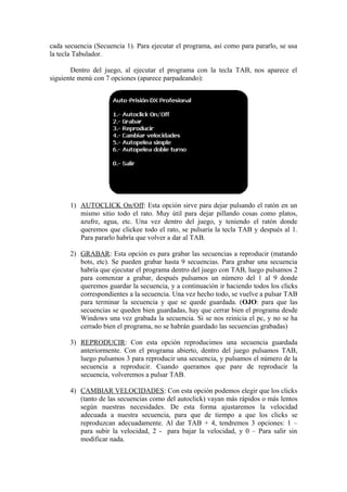 Este documento ofrece una guía básica sobre el uso del programa Autoprisión DX Profesional, el cual permite automatizar los movimientos del ratón y clicks para repetir operaciones en el juego La Prisión de forma legal. Explica cómo descargar el programa de forma segura desde la página web oficial del juego, y cómo usar sus funciones como grabar y reproducir secuencias de clicks, ajustar la velocidad, y ejemplos básicos de secuencias para cazar, matar y registrar bots.