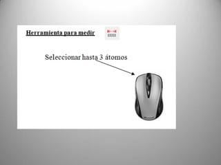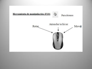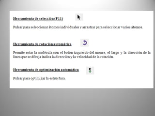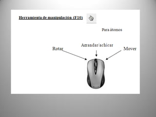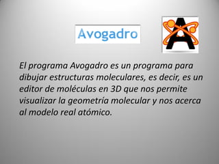 Este documento describe las funcionalidades del software AVOGADRO, que permite construir y editar moléculas orgánicas e inorgánicas. Explica cómo dibujar átomos y enlaces para crear moléculas, optimizar su geometría, y visualizarlas de diferentes formas. También cubre herramientas para manipular moléculas existentes, seleccionar átomos y fragmentos, y calcular ángulos entre enlaces. El software genera archivos CML para intercambiar información química con otras aplicaciones.