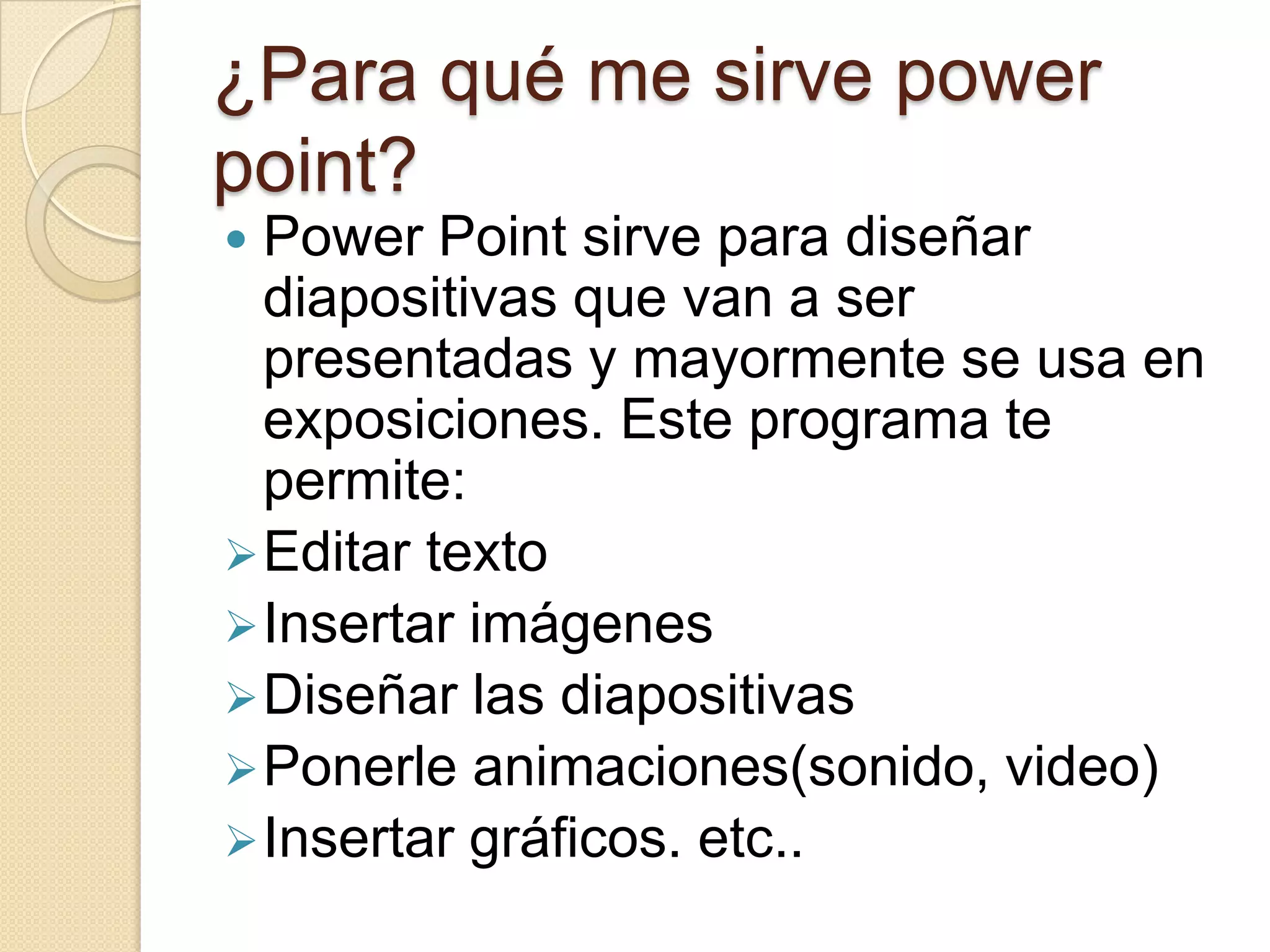 Este documento explica cómo usar PowerPoint para crear diapositivas de presentación. Detalla los pasos para iniciar PowerPoint, crear una nueva presentación, seleccionar un diseño de plantilla e insertar texto en las diapositivas. El objetivo principal de PowerPoint es diseñar diapositivas para exposiciones mediante la edición de texto, inserción de imágenes y gráficos, y agregar animaciones.