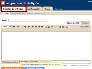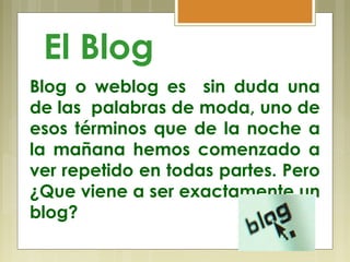 Este documento explica qué es un blog y sus usos para la enseñanza y el aprendizaje. Un blog es una publicación en línea de historias publicadas con alta frecuencia en orden cronológico inverso. Los blogs pueden usarse como un recurso educativo tanto para profesores como para estudiantes, permitiendo compartir conocimiento, anuncios y tareas.