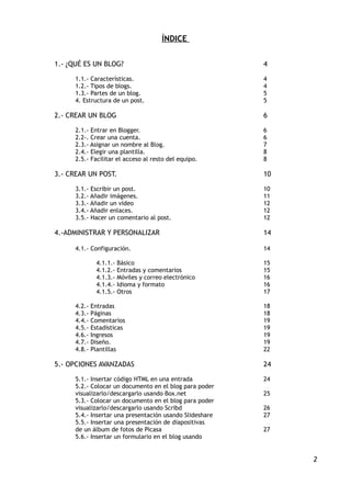 Este documento proporciona instrucciones para crear y administrar un blog usando la plataforma Blogger de Google. Explica cómo crear una cuenta de Blogger, configurar un nuevo blog asignándole un nombre y plantilla, y cómo crear nuevas publicaciones o posts agregando texto, imágenes, videos y otros contenidos. También cubre opciones avanzadas como insertar código HTML y cómo administrar y personalizar la configuración, diseño, plantillas y permisos del blog.