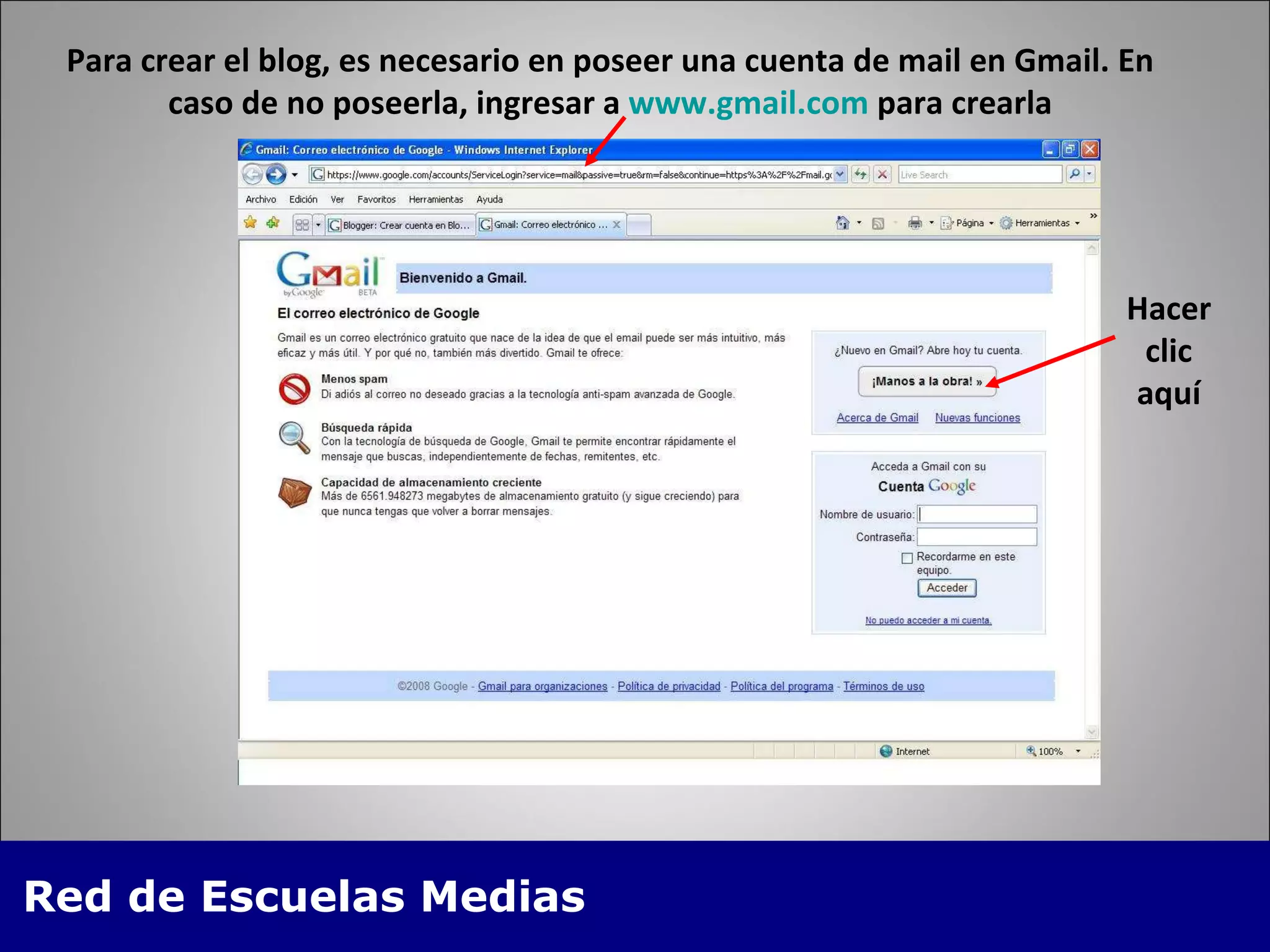 El documento proporciona instrucciones paso a paso para crear una cuenta de Gmail y un blog en Blogger. Explica cómo configurar la cuenta de Gmail, crear el blog en Blogger eligiendo un nombre, diseño y configuraciones básicas, y cómo publicar entradas y comentarios en el blog. También cubre cómo personalizar el diseño y configuración avanzada del blog.