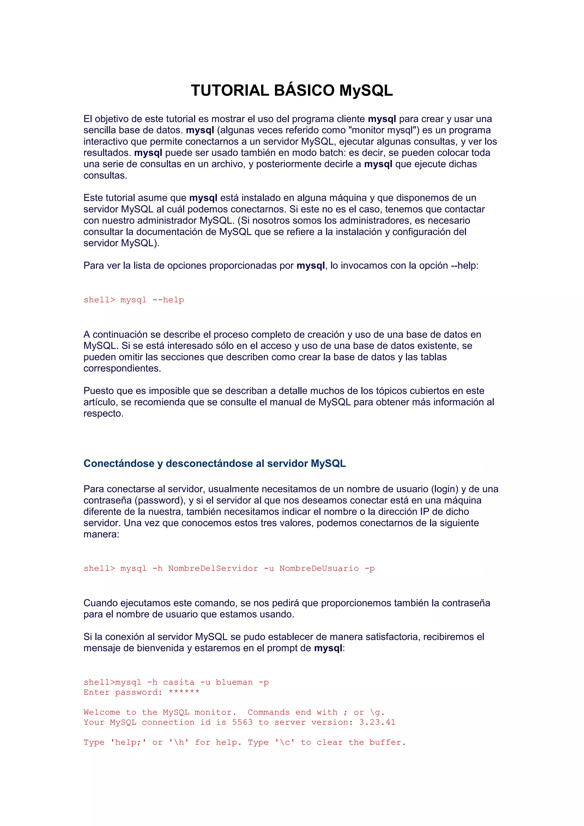 Este documento proporciona una introducción al uso del programa cliente mysql para crear y usar una base de datos sencilla. Explica cómo conectarse a un servidor MySQL, crear una base de datos y tablas, insertar y consultar datos, y proporciona ejemplos de comandos básicos de SQL.