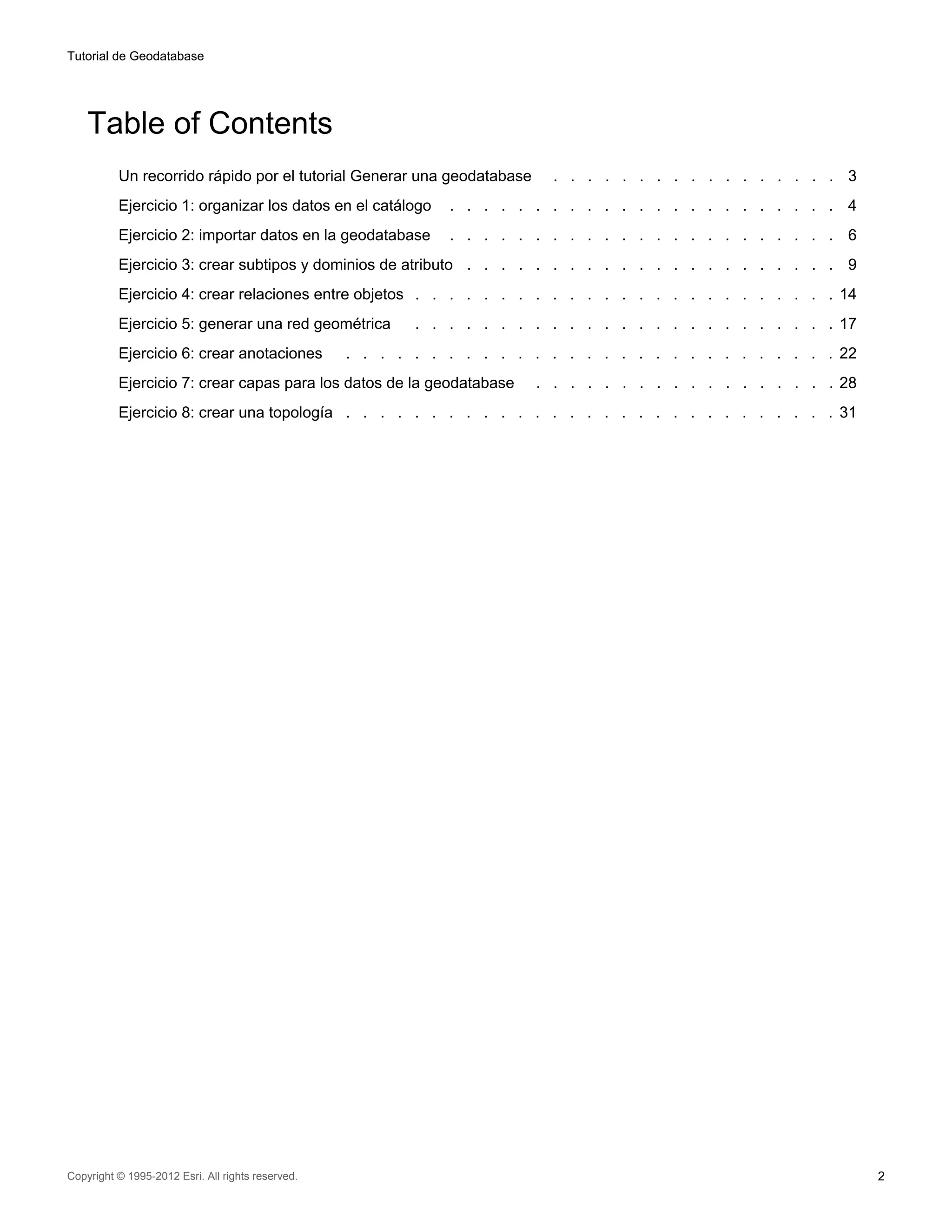 Este documento presenta un tutorial para crear una geodatabase que modela una red de suministro de agua. El tutorial consta de 8 ejercicios en los que se importan datos a la geodatabase, se crean subtipos, dominios de atributo, relaciones entre objetos, una red geométrica y capas. El objetivo es aprovechar las capacidades de la geodatabase agregando comportamiento a los datos mediante herramientas de administración de datos sin necesidad de programación.