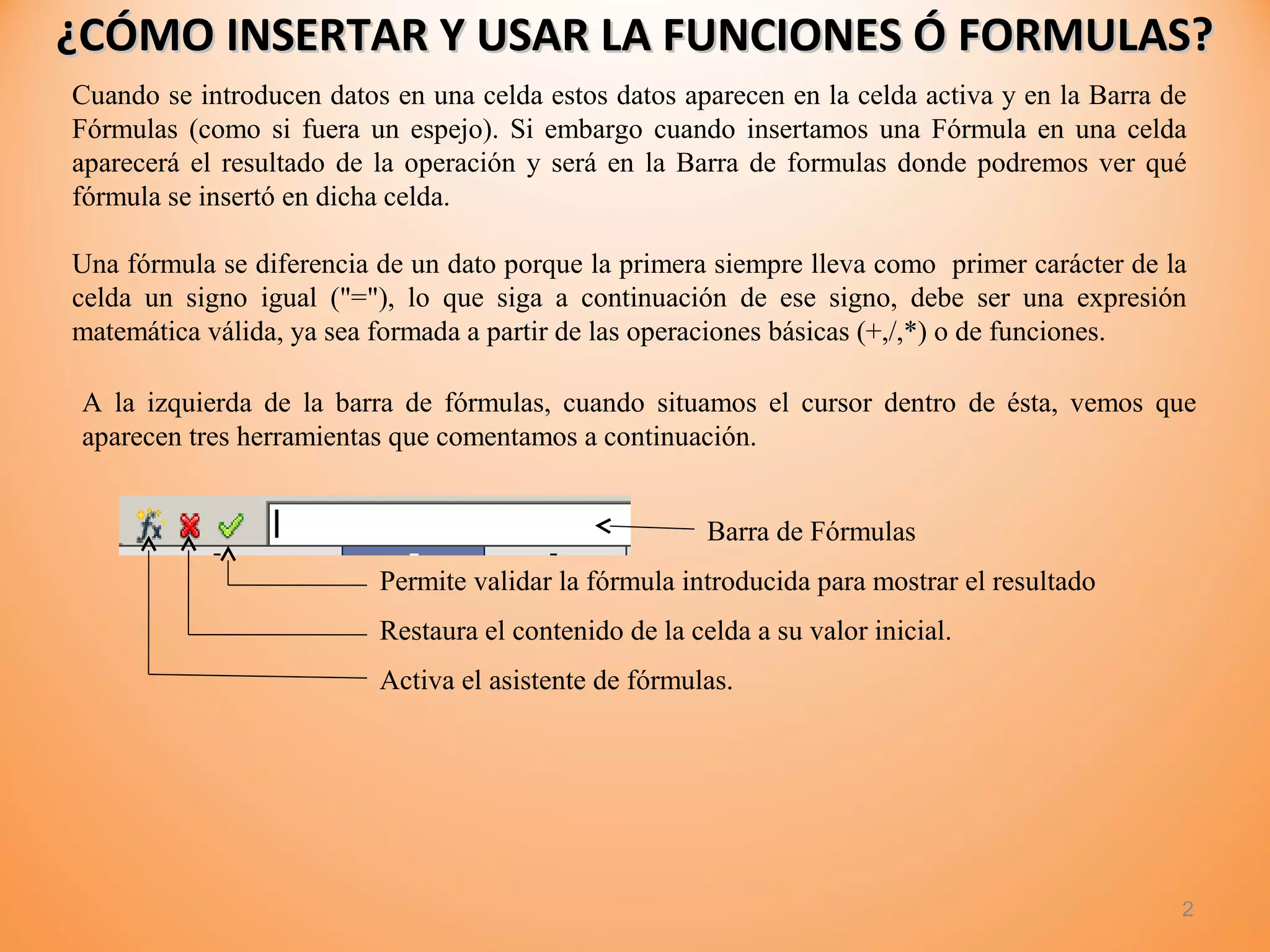 Este documento proporciona instrucciones sobre cómo insertar y usar fórmulas y funciones, y cómo crear gráficos en OpenOffice Calc. Explica cómo diferenciar datos de fórmulas, cómo insertar fórmulas simples utilizando referencias de celda y el asistente de fórmulas, y describe funciones matemáticas comunes como suma, promedio y más. También detalla el proceso de creación de gráficos a partir de datos de tabla, incluida la selección del tipo de gráfico y los datos, y cómo editar gráf