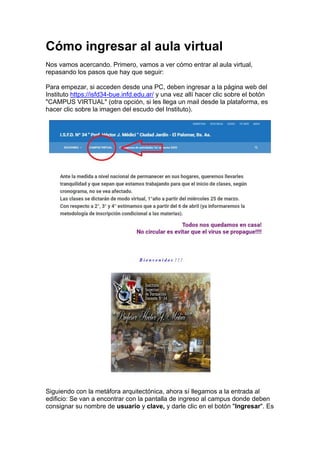El documento presenta un tutorial sobre el uso del campus virtual, explicando cómo acceder al aula virtual, la estructura básica del aula que incluye menús en la parte superior e izquierda y un área central, y los recursos disponibles como clases, foros y correo interno para el intercambio entre estudiantes y profesores.