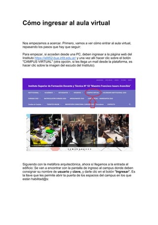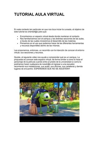 El documento presenta una guía para familiarizarse con el entorno virtual de un aula, incluyendo cómo ingresar, la estructura básica del aula con menús y secciones, y las herramientas disponibles como clases, foros y correo interno para realizar actividades y comunicarse.