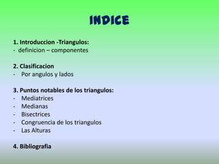 Este documento define y clasifica los triángulos. Explica que un triángulo tiene tres lados y tres ángulos internos que suman 180°. Los clasifica según la longitud de sus lados (equilatero, isósceles, escaleno) y según la medida de sus ángulos (agudo, recto, obtuso). También describe puntos notables como las mediatrices, medianas, bisectrices de ángulos e introduce conceptos como la congruencia y alturas de los triángulos.