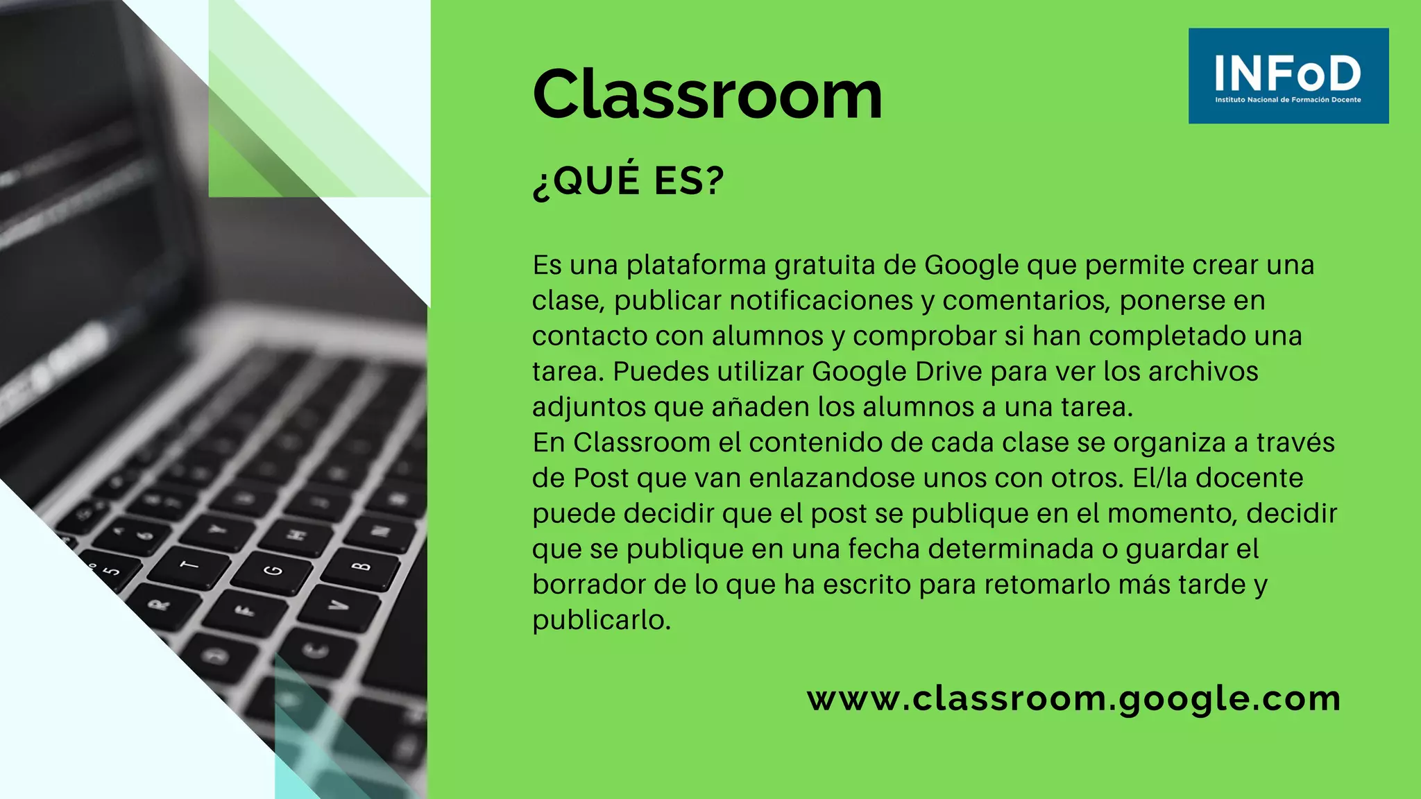 Google Classroom es una plataforma gratuita de Google que permite a docentes crear clases, publicar contenidos y tareas, y comunicarse con estudiantes. Los docentes pueden organizar el contenido de cada clase a través de publicaciones y decidir cuándo publicarlas. También pueden revisar si los estudiantes completaron las tareas asignadas.