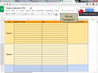 El documento proporciona instrucciones para compartir un archivo en Google Drive. Explica que los usuarios deben hacer clic en "compartir", luego en "Avanzada" para cambiar los permisos a "Si: cualquier usuario con el enlace" y seleccionar "Puede editar". Finalmente, los usuarios hacen clic en "Guardar" para copiar y enviar el enlace compartido a otros.