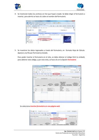 El documento explica cómo insertar un formulario de Google en un sitio web. Primero se obtiene el código HTML del formulario en Google Docs y se copia. Luego se edita la página web, se pega el código HTML en el editor y se guardan los cambios para mostrar el formulario.