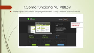 Netvibes es un lector de RSS que permite a los usuarios crear una cuenta gratis, personalizar su escritorio virtual agregando widgets de noticias y páginas web de diferentes categorías y países, y compartir el contenido en redes sociales. Los usuarios pueden agregar contenido seleccionando widgets o ingresando URLs directamente, y también pueden eliminar widgets existentes.