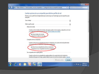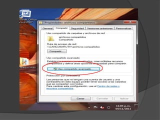 El documento proporciona instrucciones para configurar una red inalámbrica abierta sin contraseña para compartir archivos entre computadoras, incluyendo los pasos de abrir la ventana de conexión de redes, configurar una nueva conexión de red ad hoc inalámbrica sin clave, y crear y compartir una carpeta para que otros usuarios puedan acceder a los archivos compartidos a través de la red.