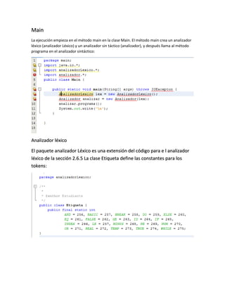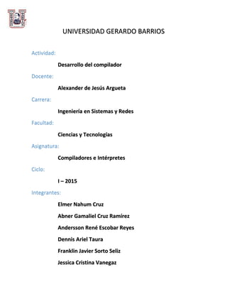 Este documento describe el desarrollo de un compilador realizado por estudiantes de la Universidad Gerardo Barrios. El compilador consta de un analizador léxico que reconoce tokens como números, identificadores y palabras reservadas, y un analizador sintáctico que genera un árbol sintáctico. El analizador léxico extiende código existente y define clases para diferentes tipos de tokens. El analizador sintáctico llama al método programa para generar el árbol a partir de los tokens producidos por el analizador l