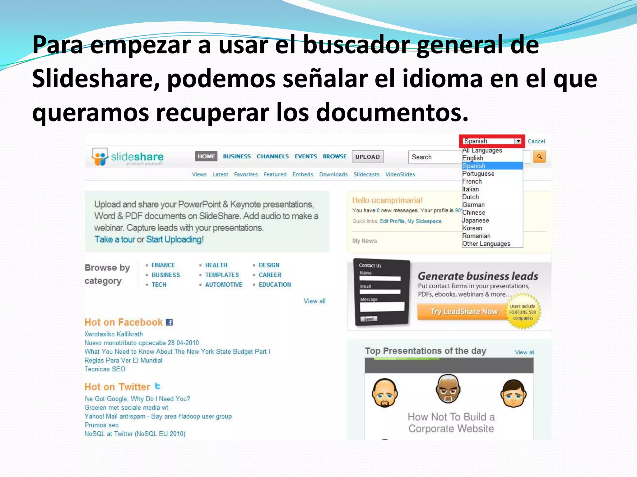 Este documento proporciona instrucciones sobre cómo usar la plataforma Slideshare, incluyendo cómo realizar búsquedas básicas y avanzadas, registrar una cuenta, editar un perfil de usuario, subir presentaciones, editar metadatos de presentaciones, descargar presentaciones permitidas y trasladar presentaciones a otros sitios web. Explica los pasos para crear presentaciones con música y proporciona créditos a los autores del tutorial.