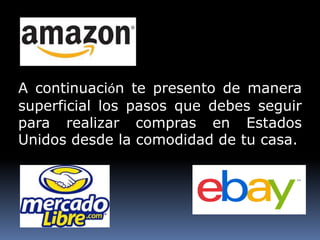 Este documento describe los tres pasos principales para realizar compras en Estados Unidos desde Venezuela: 1) Obtener una tarjeta de crédito con cupo en dólares aprobado por CADIVI, 2) Contratar los servicios de un casillero internacional en EE.UU. para recibir los paquetes, y 3) Comprar en tiendas electrónicas confiables como Amazon utilizando la tarjeta de crédito y la dirección del casillero.