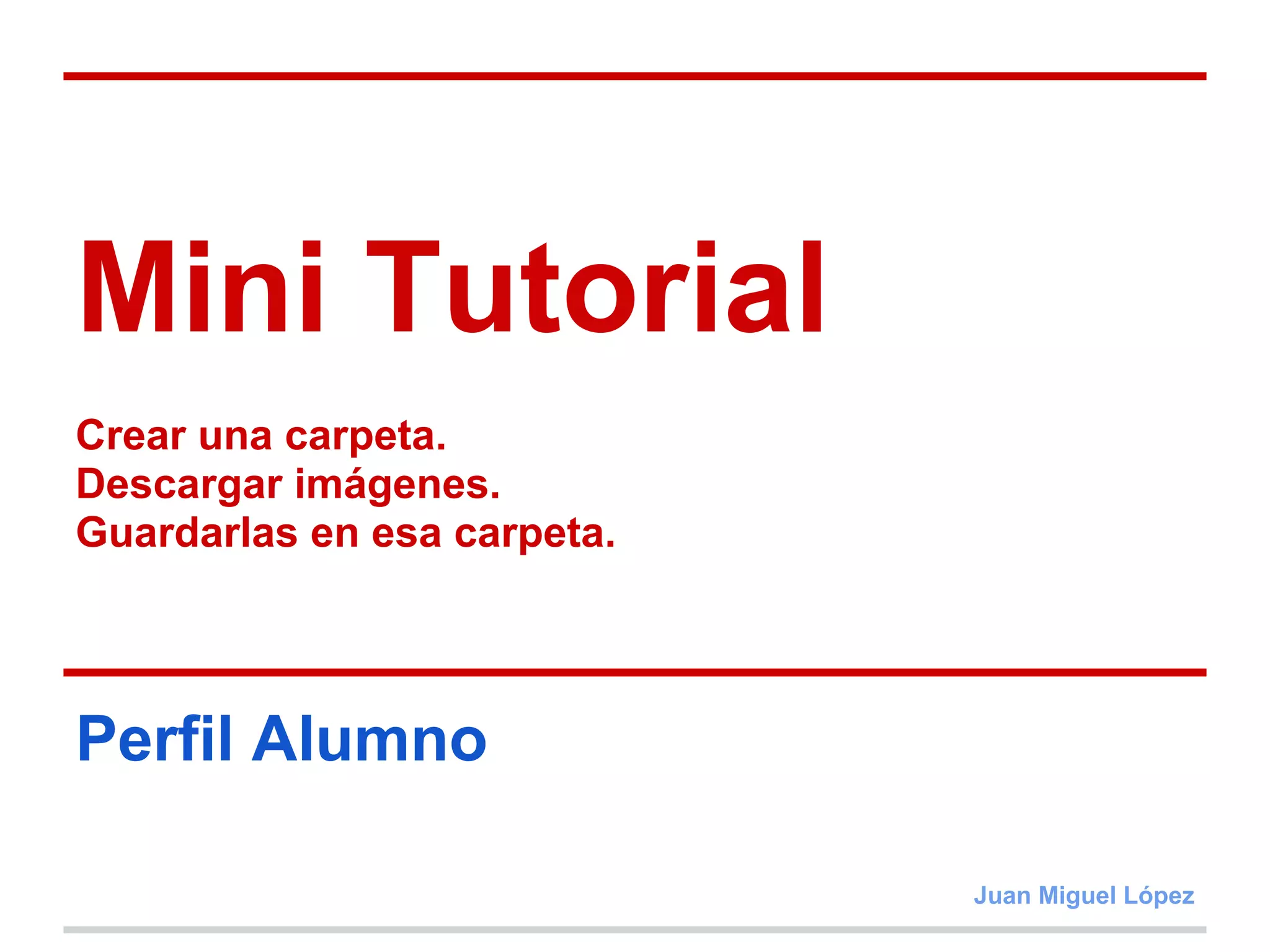 El documento describe un mini tutorial sobre cómo crear una carpeta y guardar imágenes en ella. Primero se crea una carpeta nueva y luego se descargan imágenes del ordenador para guardarlas en esa carpeta recién creada.