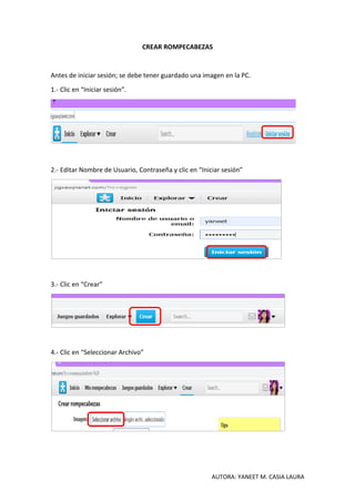 El documento proporciona instrucciones para registrarse en el sitio web JigsawPlanet y crear rompecabezas digitales. Explica los pasos para registrar una cuenta, iniciar sesión, cargar una imagen y configurar la cantidad de piezas y forma para luego compartir el enlace del rompecabezas creado.