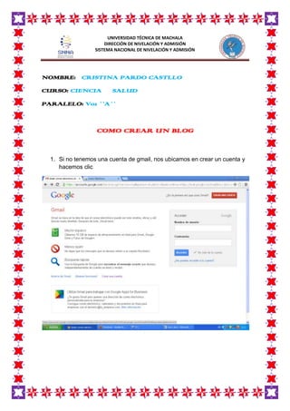 Este documento proporciona instrucciones paso a paso para crear un blog en Blogger y agregar diferentes elementos como texto, imágenes, videos y diapositivas. Explica cómo crear una cuenta de Gmail y acceder a Blogger para crear un nuevo blog. Luego describe cómo agregar y formattear texto e imágenes, insertar videos desde YouTube y diapositivas de SlideShare, y finalmente publicar el blog.