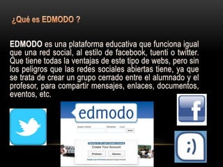 Este documento describe cómo usar la plataforma educativa Edmodo desde las perspectivas de profesores y estudiantes. Explica que los profesores deben crear una cuenta, luego crear un grupo para su curso con un nombre y código único, mientras que los estudiantes se registran usando el código del grupo asignado por su profesor para unirse a la clase virtual.