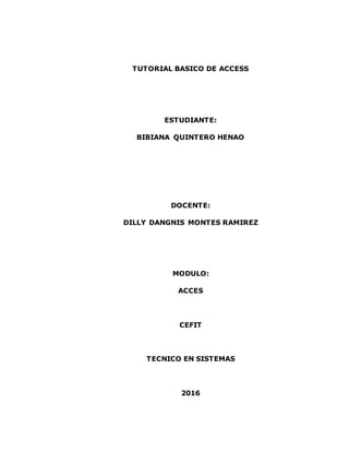 Este documento presenta un tutorial básico de Microsoft Access. Explica conceptos clave como tablas, campos, registros, llaves primarias y foráneas. También cubre la creación de formularios, informes, consultas y paneles de control. El documento concluye que Access es una herramienta útil para crear y manipular bases de datos para pequeñas empresas.
