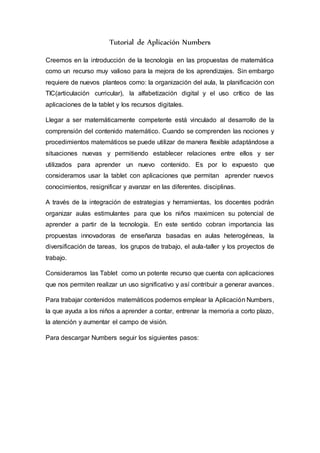 El documento describe el uso de la aplicación Numbers en tabletas para enseñar matemáticas de manera innovadora. Se argumenta que la tecnología puede mejorar el aprendizaje si se usa de forma crítica y se organizan las aulas de manera estimulante. La aplicación Numbers permite contar, entrenar la memoria y atención de los niños de manera gradual en diferentes niveles de dificultad.