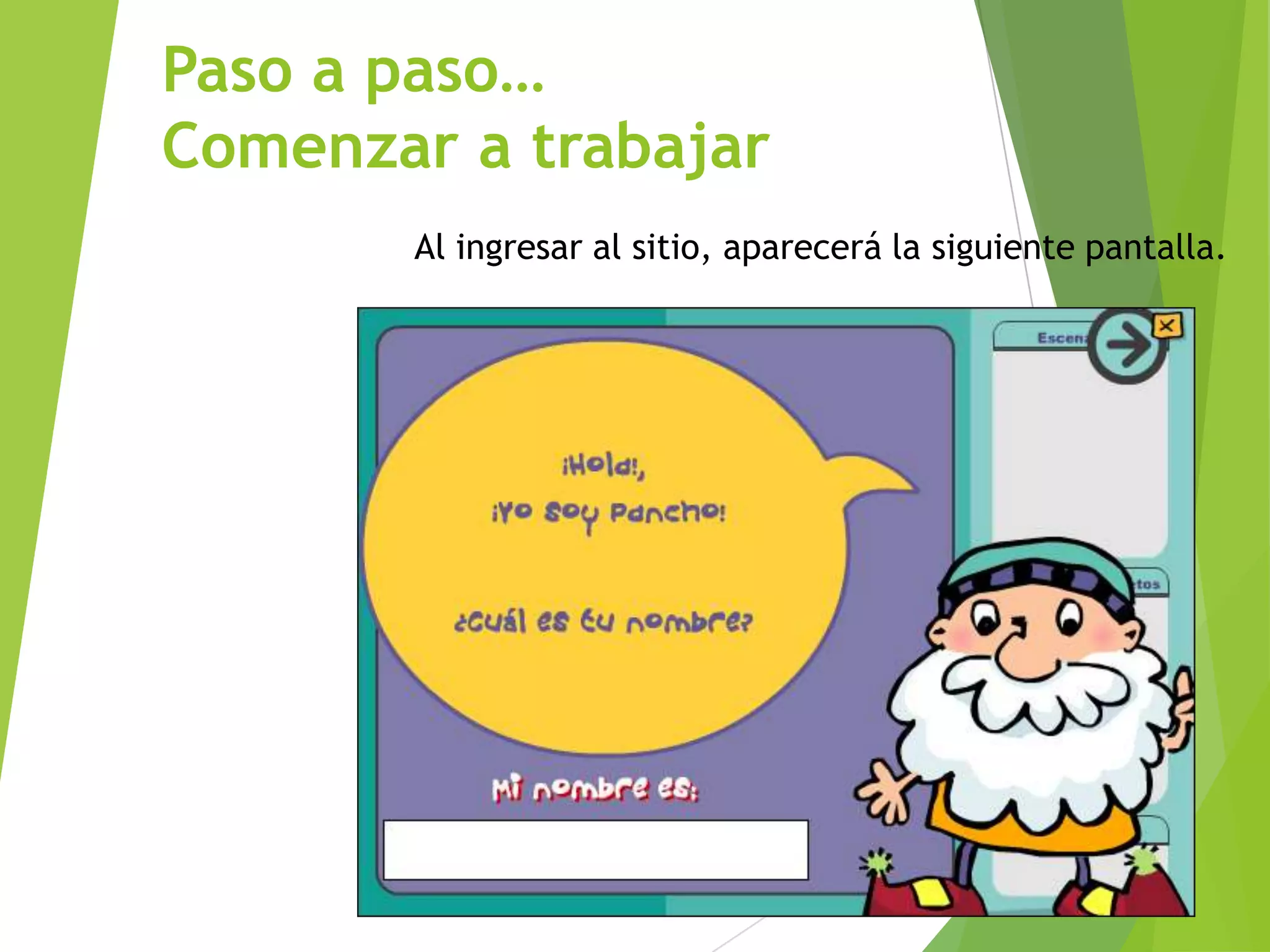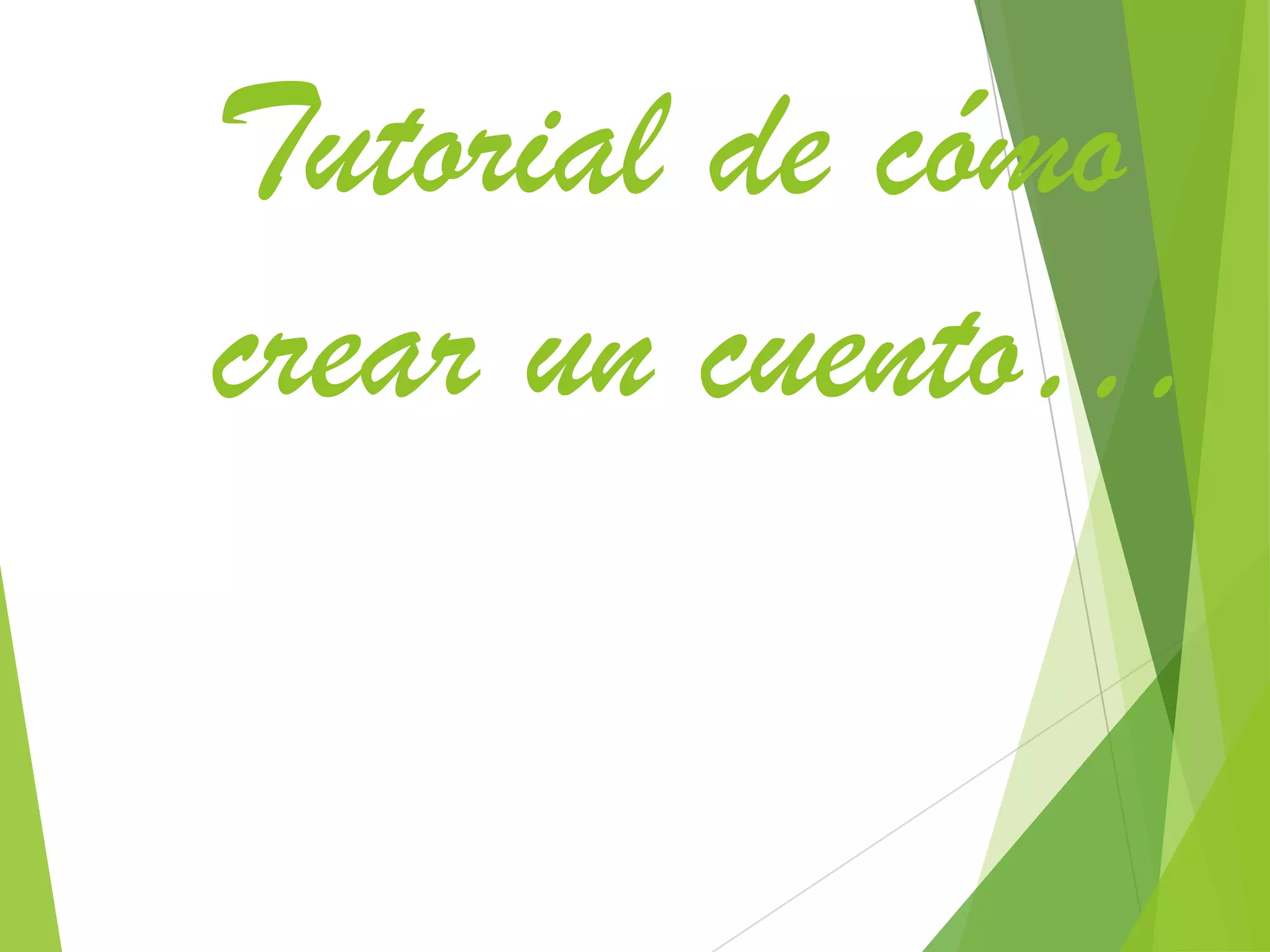 El documento proporciona instrucciones paso a paso para crear un cuento en un sitio web, incluyendo cómo comenzar, elegir escenarios, personajes y música, insertarlos en las escenas, escribir la historia y guardar el cuento completo.