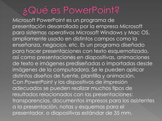Microsoft PowerPoint es un programa de presentaciones ampliamente utilizado para crear presentaciones con texto, imágenes y animaciones. Permite aplicar diseños de fuente, plantillas y efectos de animación. Con PowerPoint se pueden generar diapositivas, transparencias e impresos para audiencias.