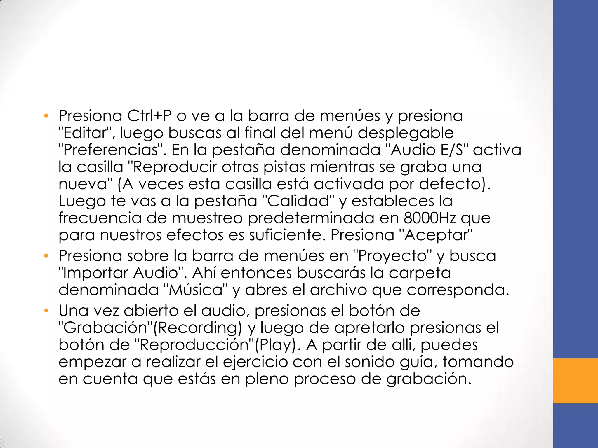 Este documento proporciona instrucciones para editar audio en Audacity. Explica cómo importar un archivo de audio, grabarlo mientras se reproduce, eliminar ruido seleccionando una sección silenciosa y usándola como perfil de ruido, normalizar la amplitud de la grabación y amplificar el volumen si es necesario.