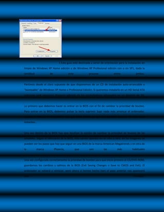 Este documento proporciona instrucciones detalladas para formatear una computadora e instalar Windows XP desde cero. Primero, se debe cambiar la prioridad de arranque en la BIOS para iniciar desde el CD de instalación de Windows. Luego, el proceso guía al usuario a través de la particionado del disco duro, la selección del sistema de archivos, y la instalación y configuración de Windows XP. Finalmente, se deben instalar controladores y software adicionales para completar la configuración del nuevo sistema operativo.