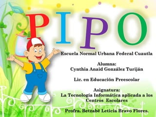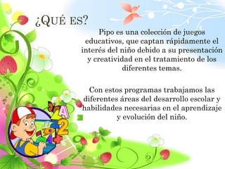 Este documento describe Pipo, una colección de juegos educativos digitales diseñados para niños de 15 meses a 12 años. Los juegos cubren diferentes áreas como lenguaje, matemáticas e inglés y son creados por profesionales de psicología infantil para que los niños aprendan jugando. Los usuarios pueden acceder a Pipo de forma gratuita en línea o pagando una suscripción para descargar el software completo.