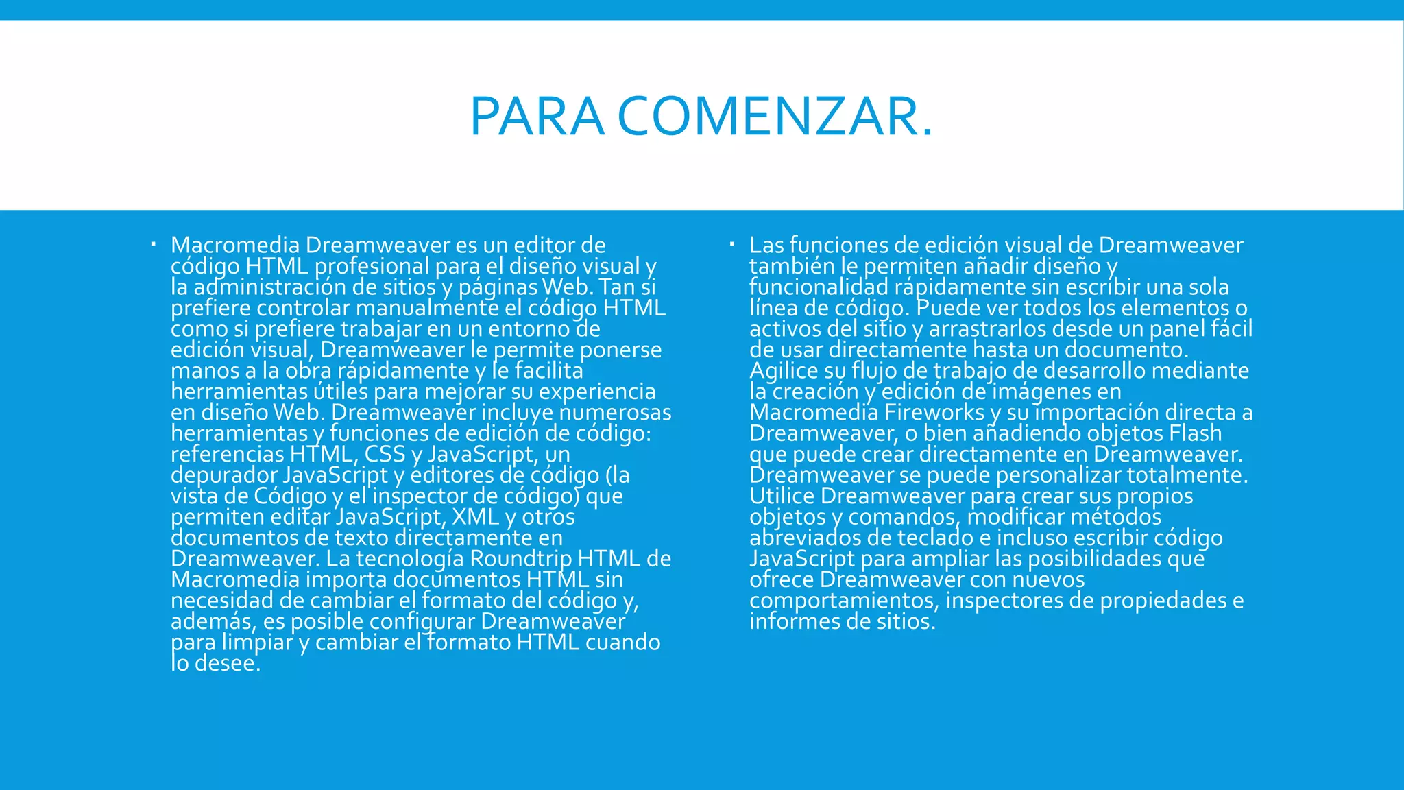 Este documento proporciona una introducción al programa Dreamweaver, incluyendo cómo instalarlo y aprender a utilizar sus funciones principales como diseñar páginas web, añadir contenido e interactividad, y publicar sitios web. También describe los requisitos del sistema, la edición de código mejorada, y cómo optimizar el flujo de trabajo con Dreamweaver.