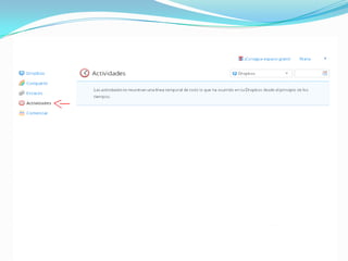 El documento proporciona 7 pasos para utilizar Dropbox: 1) descargar la aplicación Dropbox, 2) registrarse, 3) crear una carpeta Dropbox en "Mis documentos" para subir archivos a la nube, 4) subir documentos, 5) ver cómo los documentos se suben directamente a la nube, 6) compartir documentos con otros usuarios a través de enlaces incluso si no están registrados, y 7) crear una carpeta compartida con otros usuarios de Dropbox para compartir documentos de forma remota y sencilla.