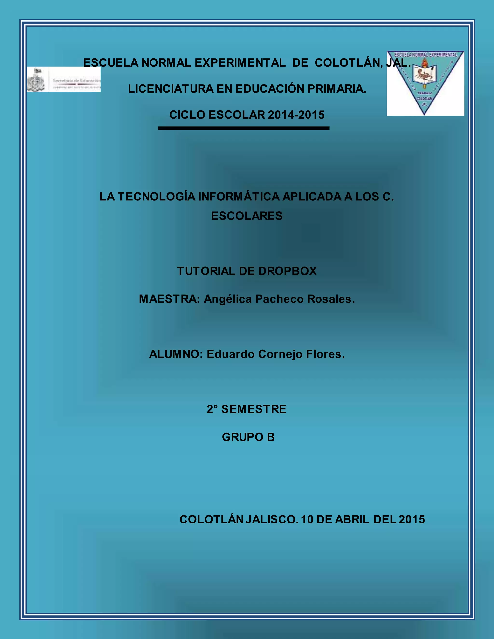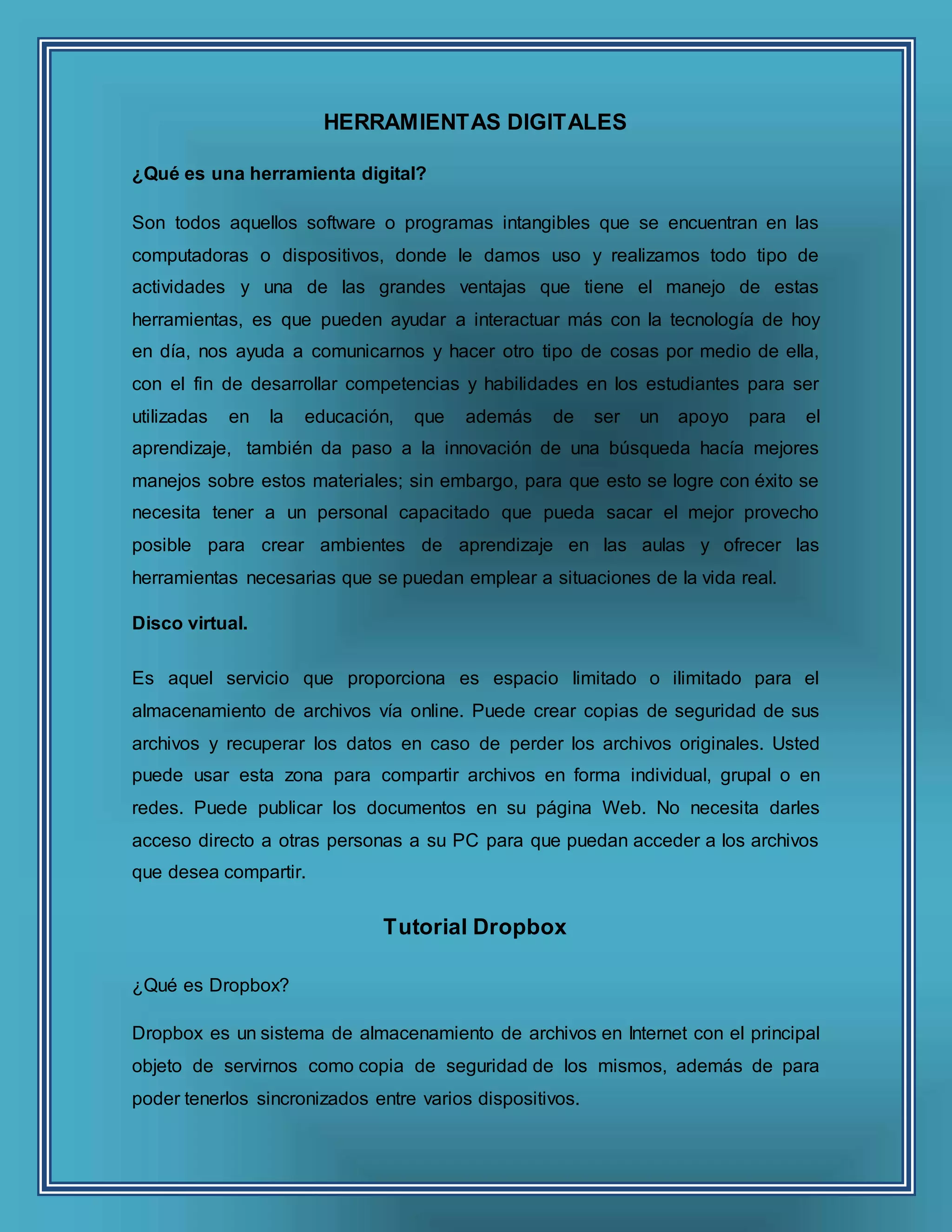 Este documento proporciona una guía sobre cómo usar Dropbox, un servicio de almacenamiento en la nube. Explica que Dropbox permite sincronizar archivos entre dispositivos y ofrece copias de seguridad. Detalla los pasos para crear una cuenta, descargar la aplicación, agregar archivos y carpetas, y compartir contenido con otros. También cubre cómo ver notificaciones, eventos y salir de la cuenta. El propósito general es mostrar cómo Dropbox puede usarse para almacenar y compartir archivos de manera segura desde cualquier lugar.