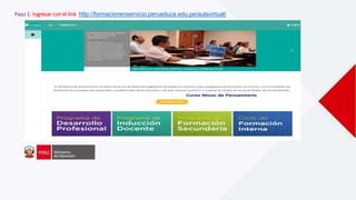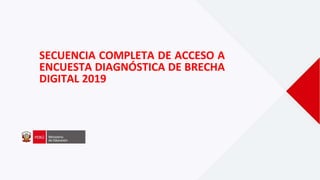El documento proporciona una secuencia de 13 pasos para completar una encuesta diagnóstica de brecha digital 2019. Los pasos incluyen ingresar a un enlace, iniciar sesión con usuario y contraseña, acceder al curso "ENCUESTA DIAGNÓSTICA_ED", responder preguntas declarativas y de conocimiento, enviar los resultados y cerrar sesión.