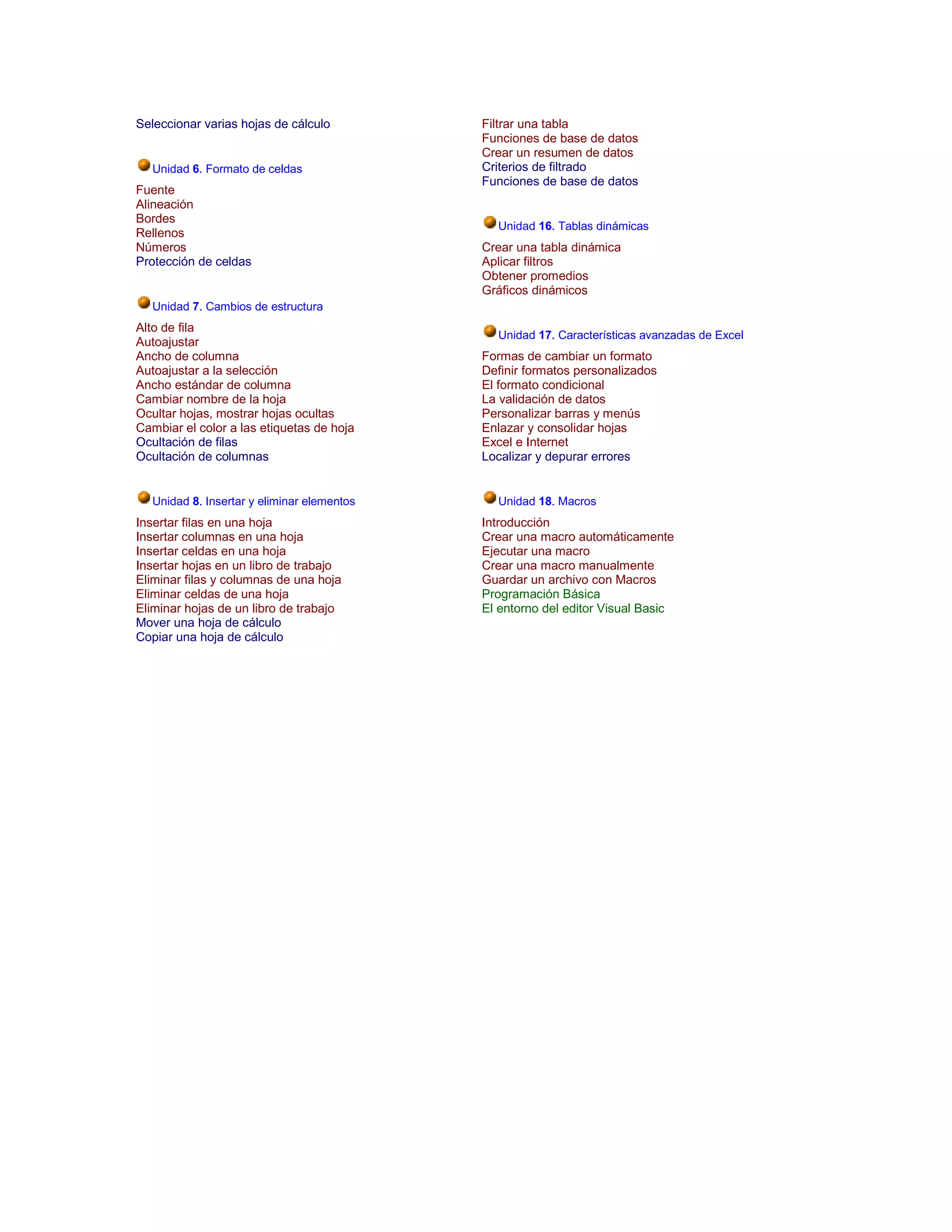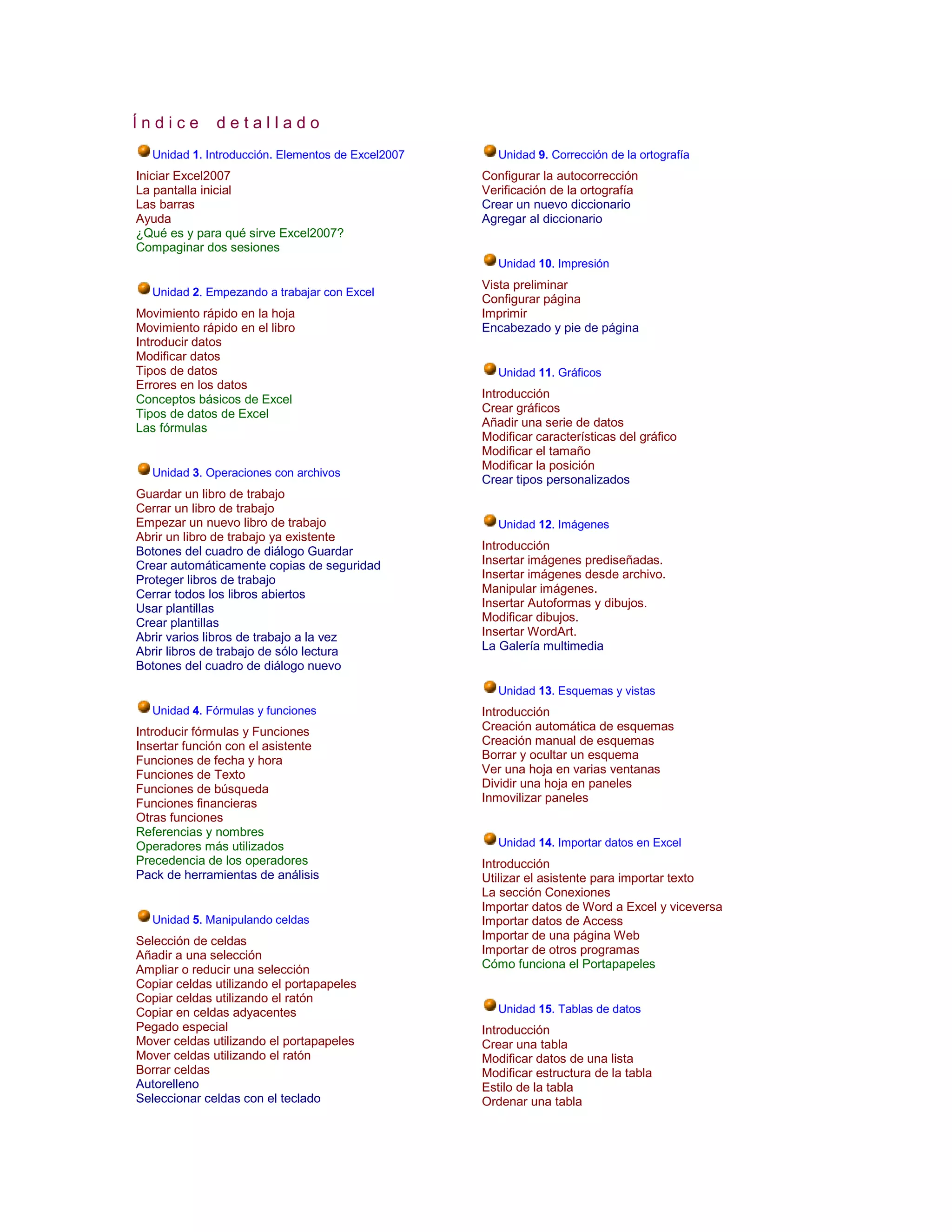 El documento proporciona un índice detallado de las 18 unidades que componen un curso sobre Excel 2007. Cada unidad cubre un tema diferente relacionado con el uso de Excel, como introducir y modificar datos, realizar operaciones con archivos, aplicar formatos a celdas, crear gráficos e imágenes, e insertar y eliminar elementos. El documento explica los objetivos de cada unidad para ayudar a los estudiantes a comprender los conceptos y herramientas básicas de Excel.