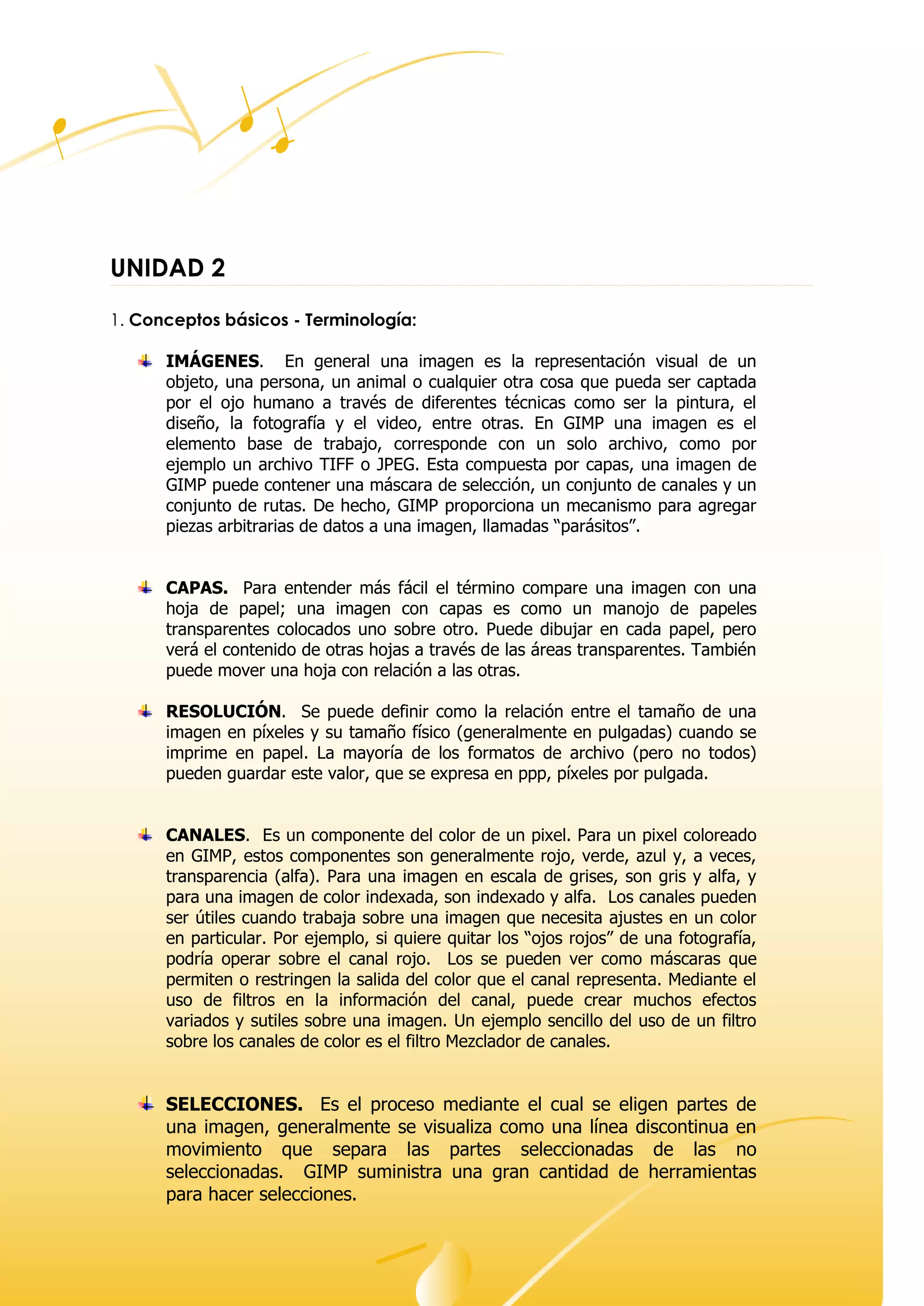 Este documento proporciona información sobre conceptos básicos de GIMP como imágenes, capas, resolución y canales. También describe tareas comunes como abrir archivos, cambiar el tamaño de imágenes, comprimir imágenes y cambiar el modo de color. Explica cómo crear un nuevo archivo, abrir uno existente arrastrándolo y usar las herramientas de escalado y guardar como JPEG para comprimir.