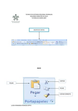 El documento presenta una lista de herramientas y funciones de Microsoft Word 2007, incluyendo opciones de formato de texto, inserción de imágenes y tablas, diseño de páginas, referencias, correspondencia y exportación a PDF. La lista es presentada por Luisa Fernanda Penagos Ortiz como parte de una tutoría sobre Word 2007 para estudiantes de sistemas en Risaralda, Colombia.