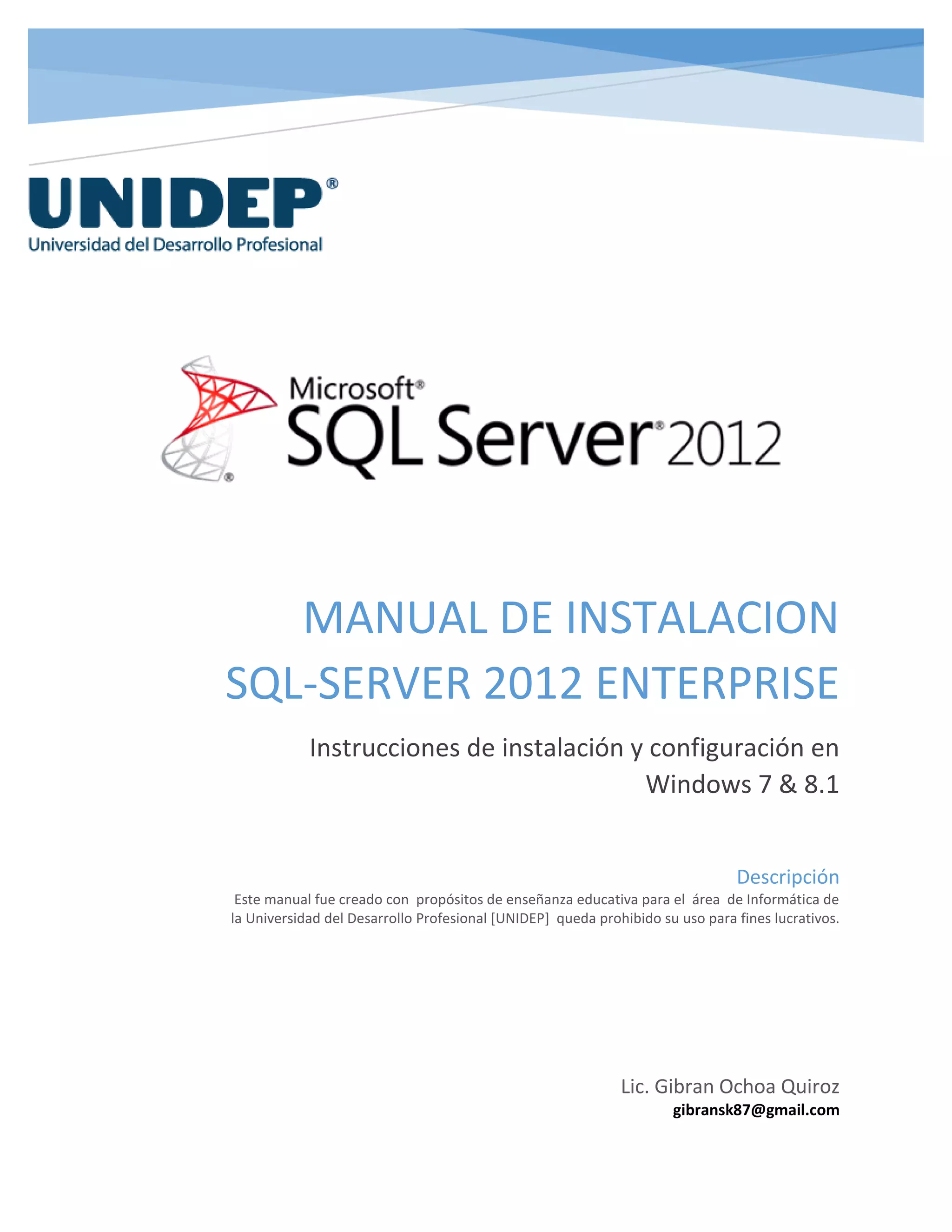 Este manual proporciona instrucciones detalladas para instalar y configurar SQL Server 2012 en Windows 7 y 8.1, enfatizando la importancia de realizar configuraciones iniciales de idioma y región para evitar errores de instalación. Se describen paso a paso las acciones necesarias desde la configuración previa hasta la instalación final del software, incluyendo la verificación de requisitos y la configuración del motor de base de datos. El documento está dirigido con fines educativos y prohíbe el uso comercial del mismo.