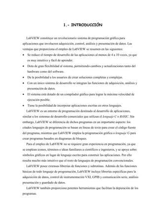 El documento presenta un tutorial sobre LabVIEW. LabVIEW es un sistema de programación gráfica que reduce el tiempo de desarrollo de aplicaciones y permite la integración de funciones de adquisición, análisis y presentación de datos. Los programas en LabVIEW se conocen como Instrumentos Virtuales y consisten en un panel frontal y un diagrama de bloques. El diagrama de bloques contiene funciones y estructuras que se conectan mediante cables para controlar las entradas y salidas del panel frontal.