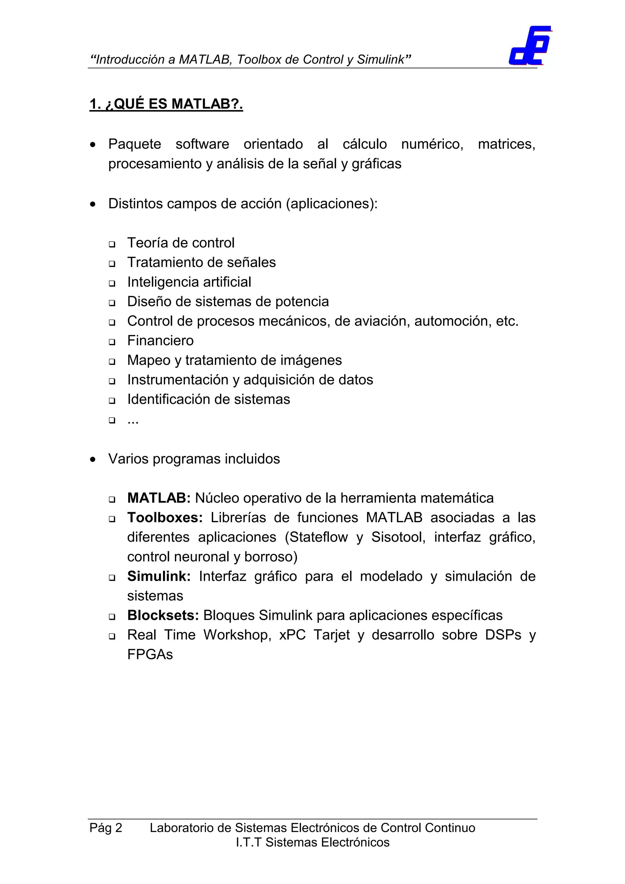El documento presenta una introducción a MATLAB, su toolbox de control y Simulink. Explica que MATLAB es un software orientado al cálculo numérico y procesamiento de señales, con aplicaciones en diversos campos como control, tratamiento de señales e inteligencia artificial. Describe las principales características de MATLAB, sus toolboxes, Simulink y los diferentes tipos de archivos. Además, introduce conceptos básicos sobre manipulación de datos, generación de matrices, variables y funciones de MATLAB.