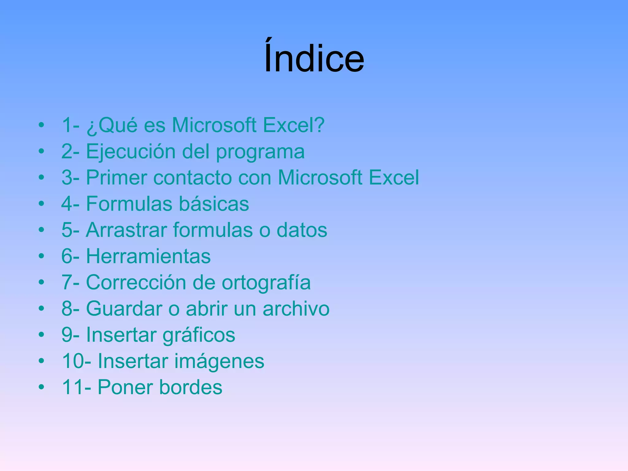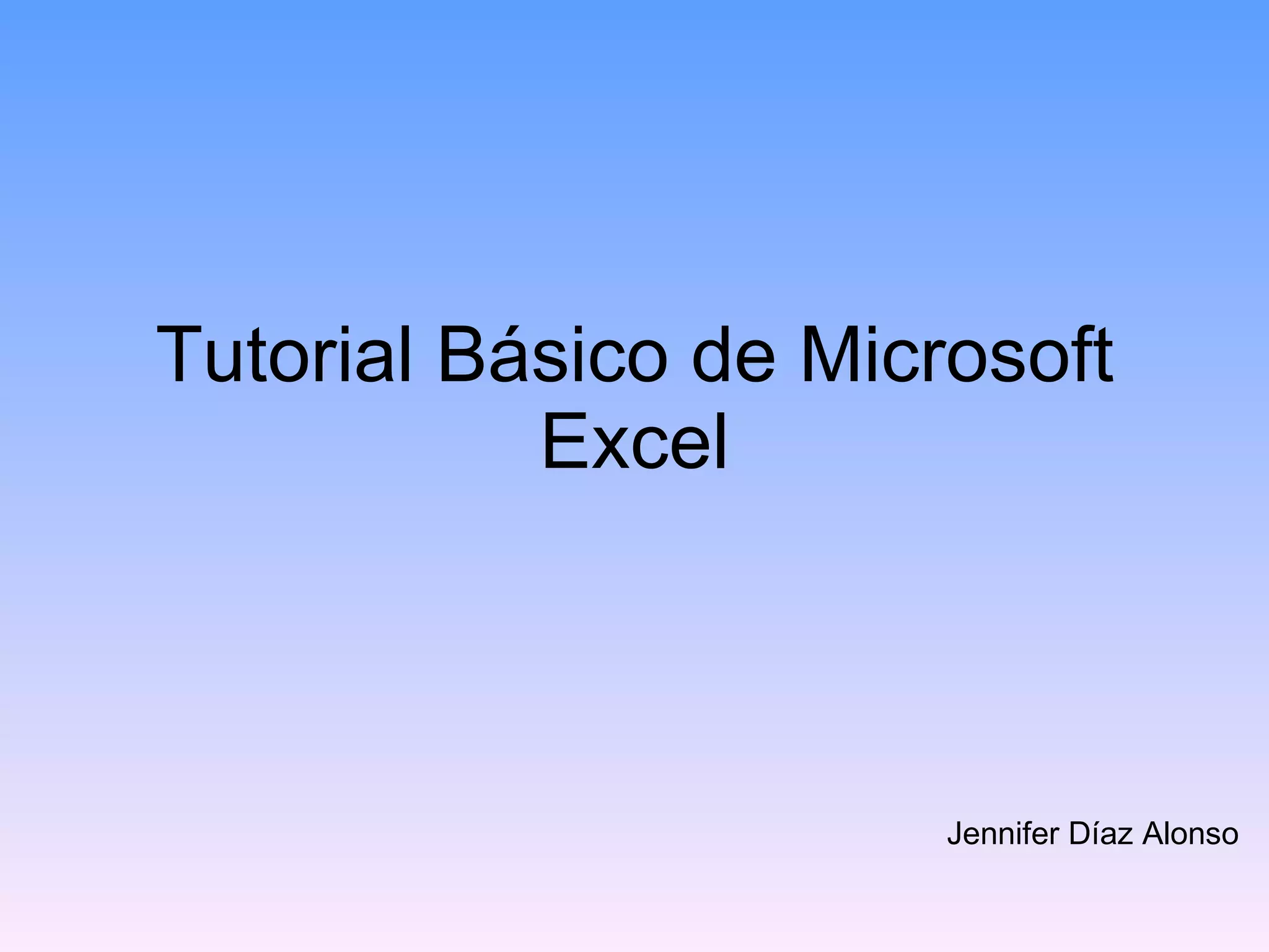 Este documento presenta un tutorial básico de Microsoft Excel. Explica las funciones principales del programa como sumar, restar, multiplicar y dividir en celdas usando fórmulas. También cubre cómo arrastrar fórmulas y datos entre celdas, insertar gráficos e imágenes, y aplicar formato como bordes y corrección ortográfica. El tutorial contiene 11 secciones que guían al usuario a través de las herramientas y funciones básicas de Excel.