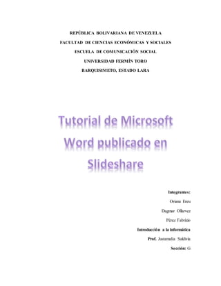 Este documento describe los elementos básicos de la ventana de Microsoft Word, incluyendo la barra de herramientas de acceso rápido, la cinta de opciones dividida en pestañas, las barras de desplazamiento, el zoom y las vistas de documento. Explica la función de cada elemento y cómo personalizar la interfaz de Word.