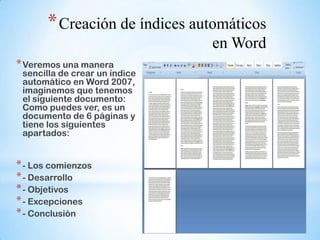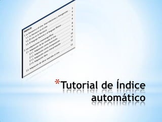 Este documento proporciona instrucciones en 3 pasos para crear un índice automático en Microsoft Word: 1) marcar los títulos de secciones utilizando estilos de título, 2) generar una tabla de contenido desde el menú Referencias, y 3) actualizar la tabla de contenido seleccionando "Actualizar toda la tabla" cuando se agregan nuevos títulos.