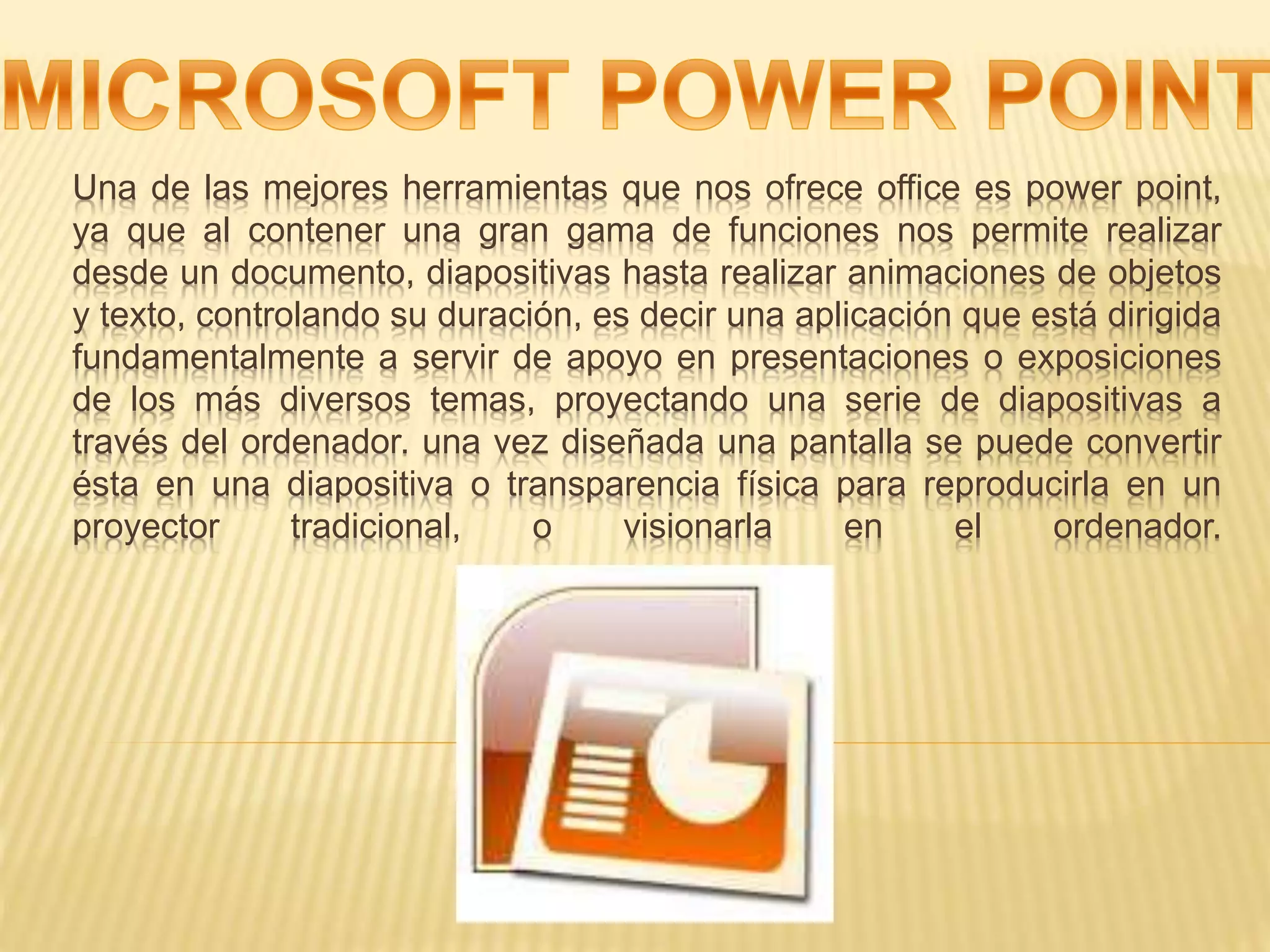 PowerPoint es una herramienta de Office que permite crear presentaciones y diapositivas con texto, imágenes y animaciones para exposiciones. Ofrece funciones para diseñar diapositivas, agregar elementos multimedia, modificar temas y diseños, y proyectar la presentación.
