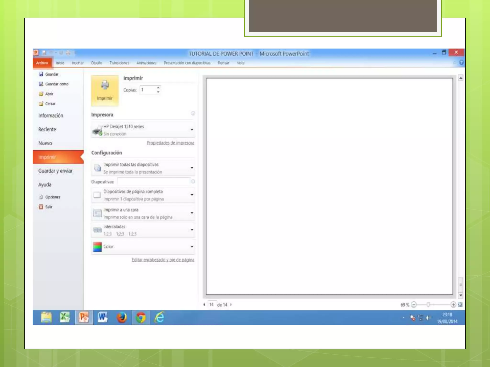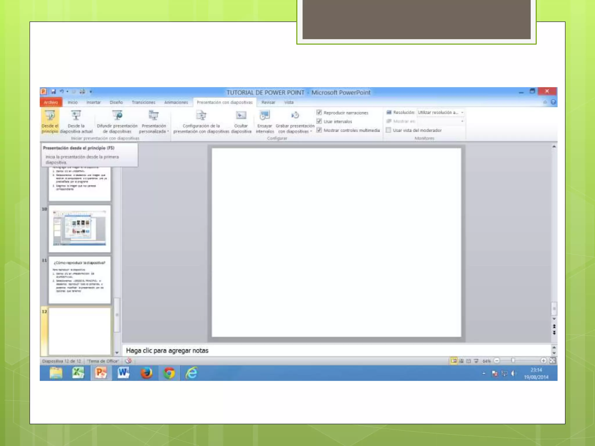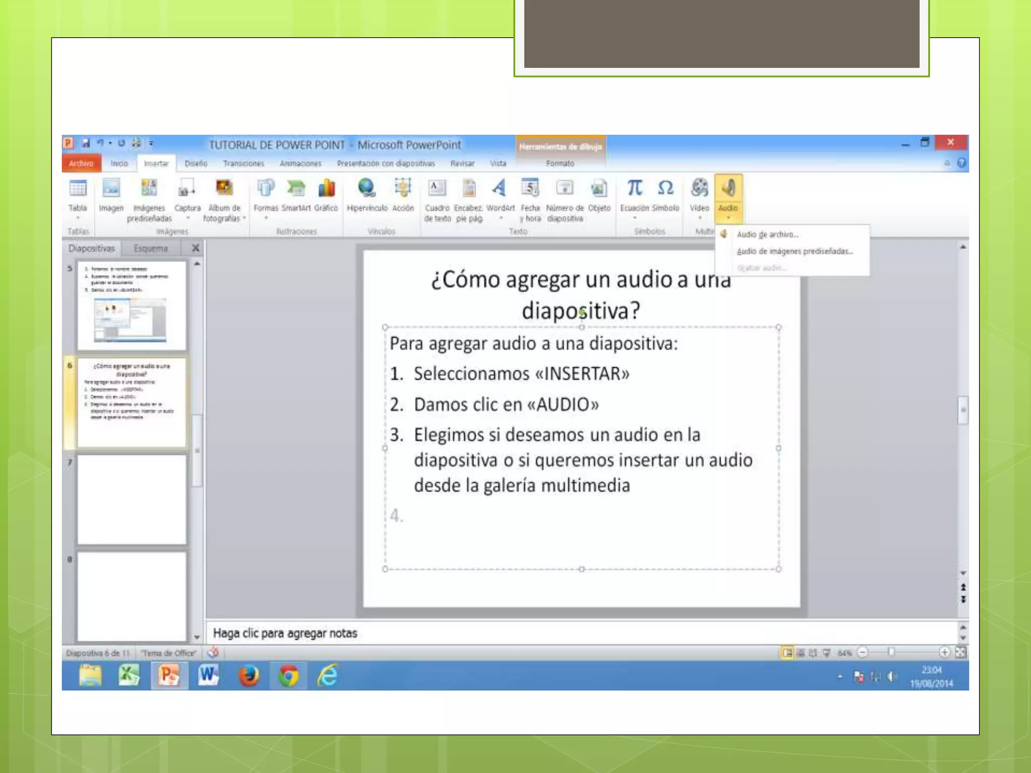 Este documento presenta un tutorial sobre cómo usar PowerPoint. Explica cómo agregar diapositivas adicionales, guardar presentaciones, agregar audio e imágenes, eliminar diapositivas, reproducir presentaciones, imprimir diapositivas y aplicar diseños.